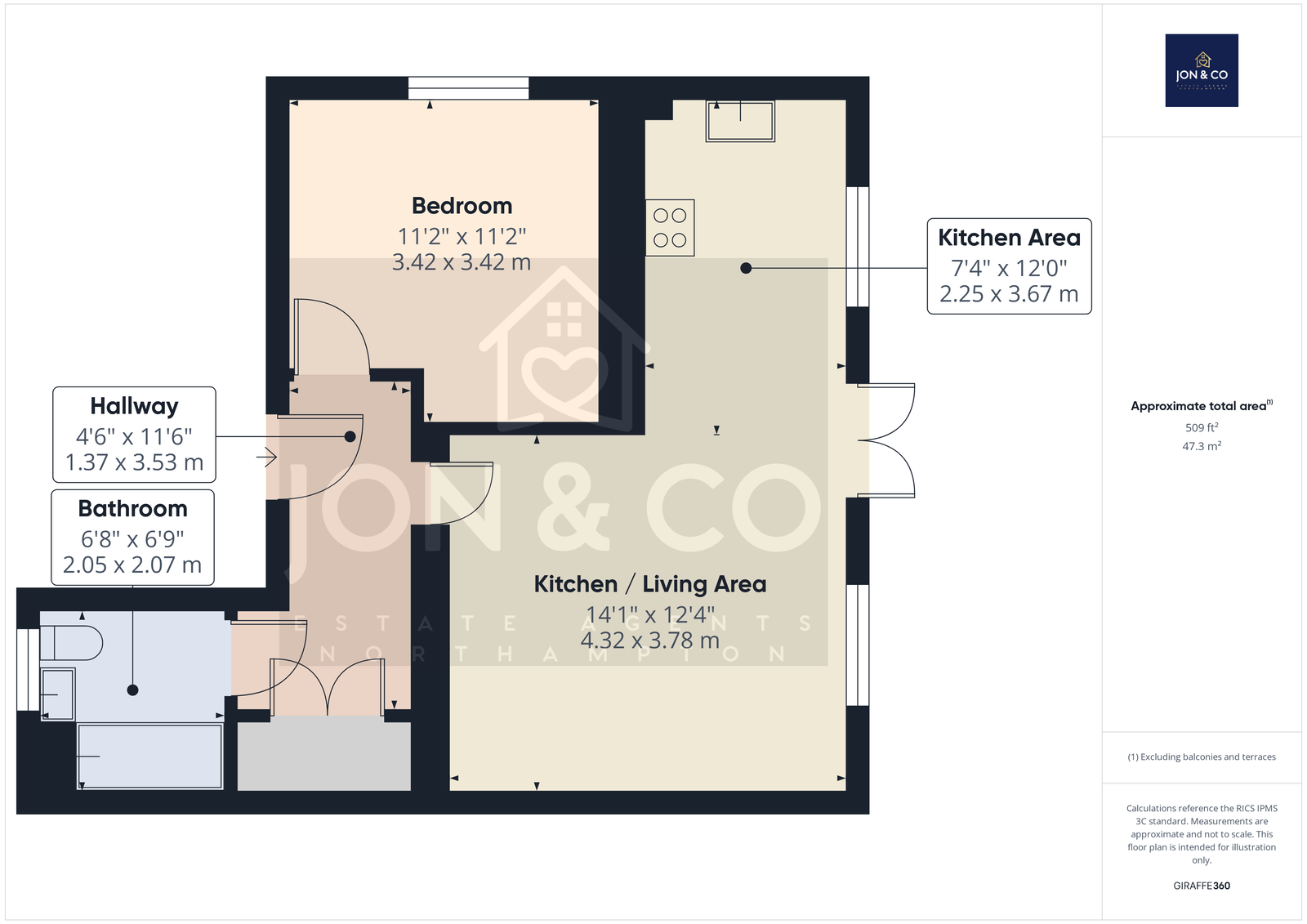 Kitchen / Living Area: 3.78m x 4.32m (12'4" x 14'1")