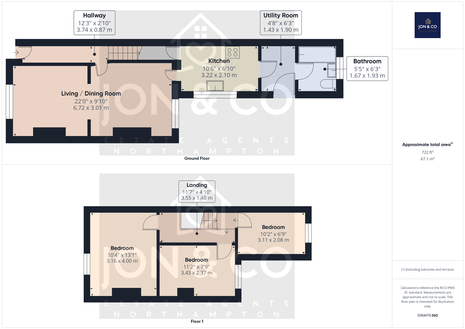 The ground floor comprises a welcoming hallway, a generous open-plan living and dining room, a modern fitted kitchen, utility room, and a bathroom. The first floor features three well-proportioned bedrooms and a central landing area.